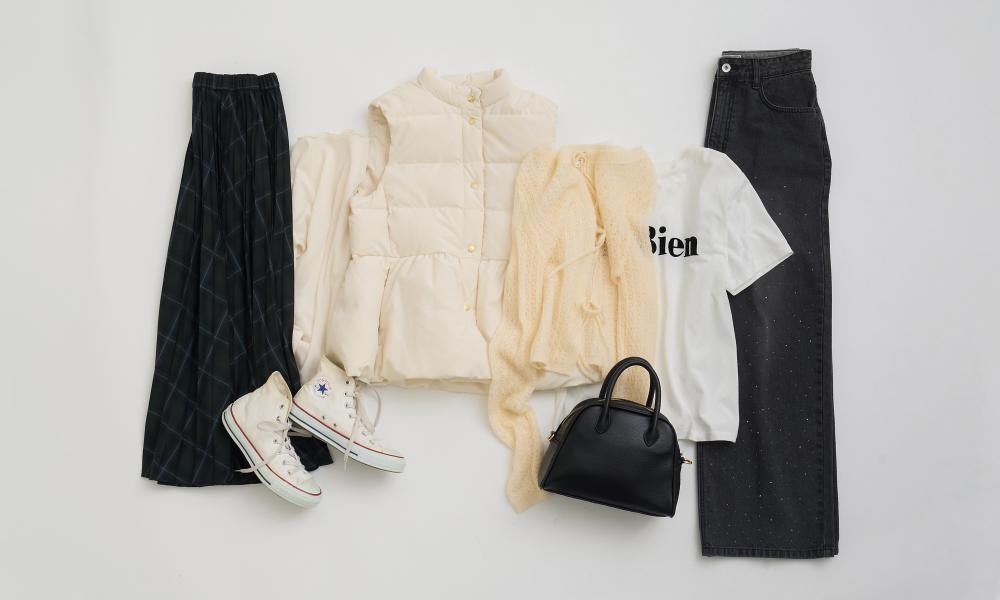アウターは、軽量で保温性も高い白のダウンベストをチョイス。