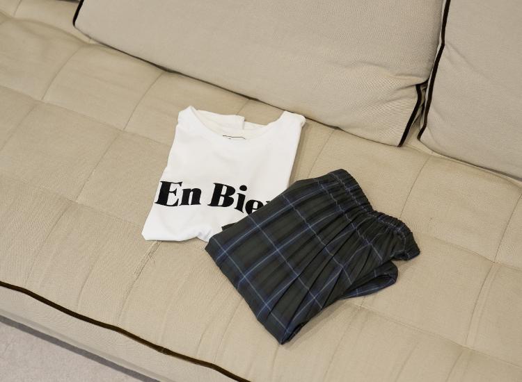 1日目のデニムはそのまま着回し、トップスを半袖ロゴTシャツにチェンジして、気分をカジュアルにシフト。