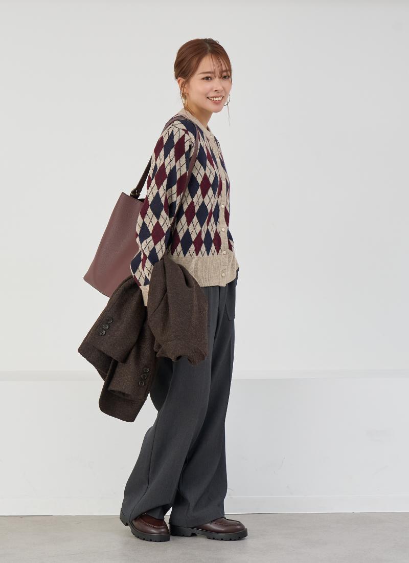 アーガイルカーデは肩がけして、コーディネイトのアクセントにしました。