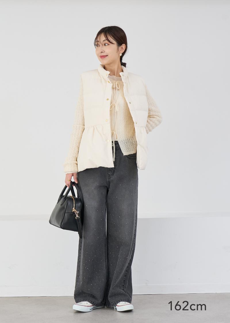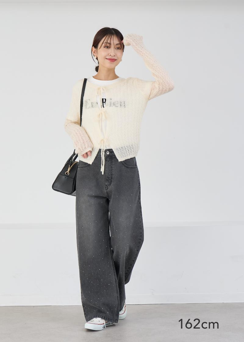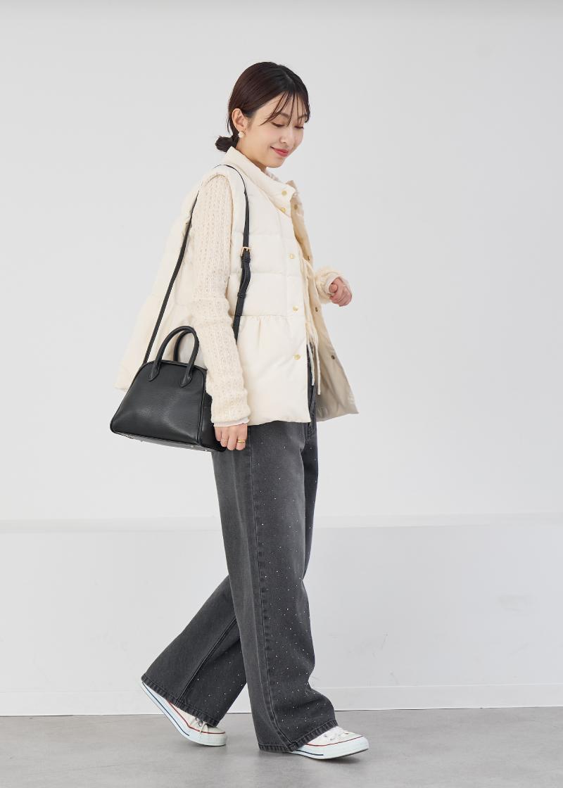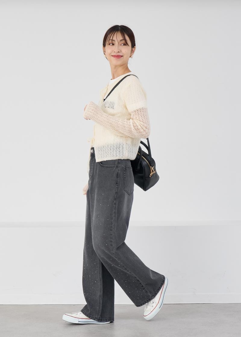 ボトムは、さりげないビジュー付きブラックデニムで程よく華やかに。