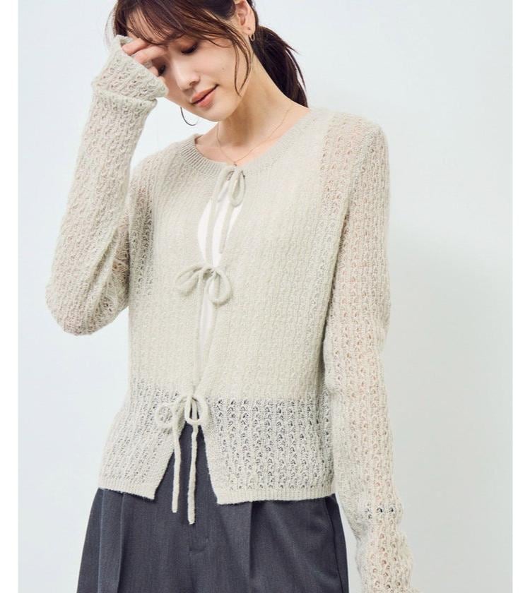 インナーは白のレースカットソーに、リボンデザインがかわいいレース編みメッシュニットカーディガンを重ねて。