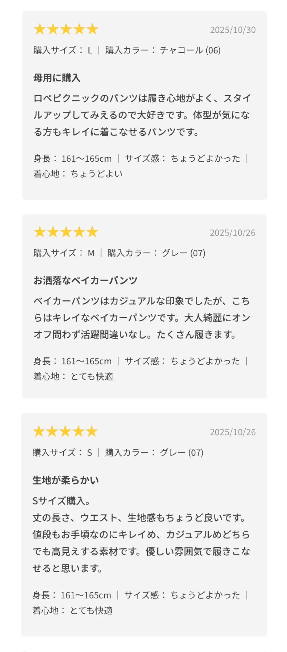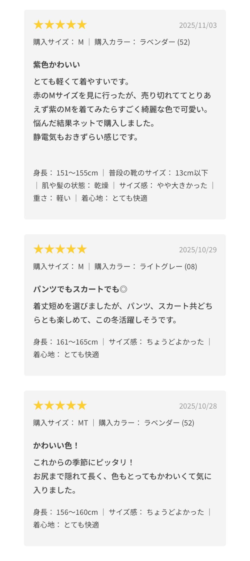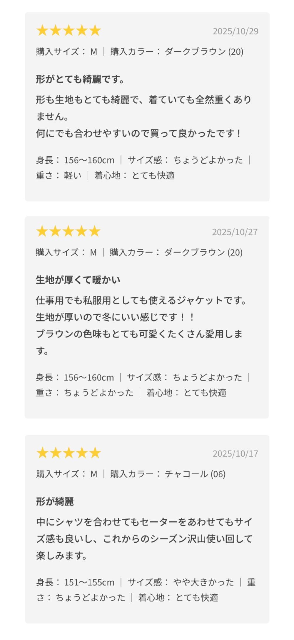 あなたの投稿するレビューも皆さまの着こなしの手助けになりますので、ぜひご感想をお寄せください。