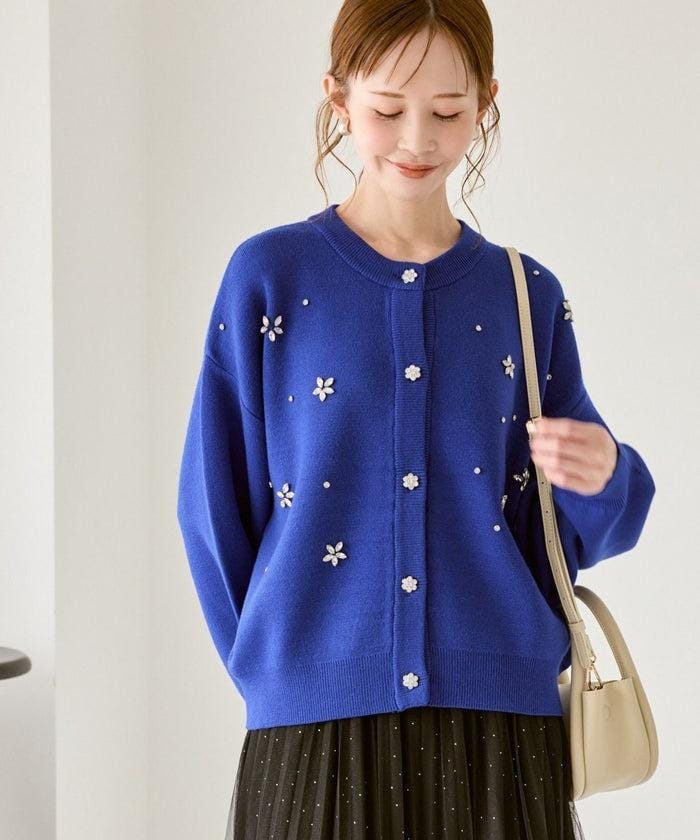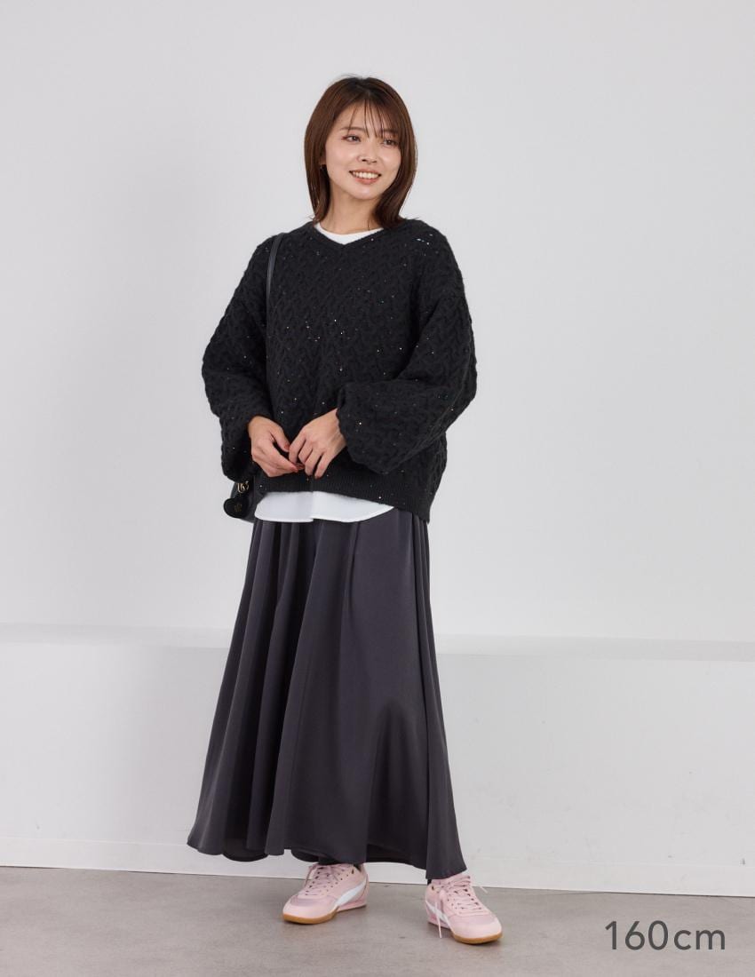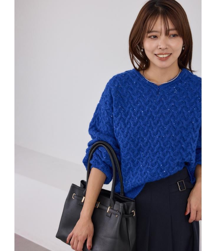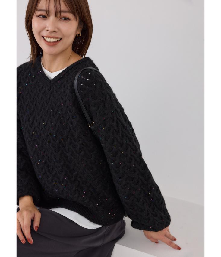 小花の形をしたスパンコールが編み地に埋め込まれたニット。Vネックで顔まわりを爽やかに着こなせるので、1枚で主役になる存在感ながら、デイリーにも着やすいのが魅力です。
