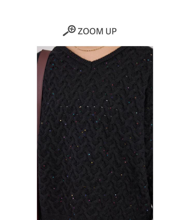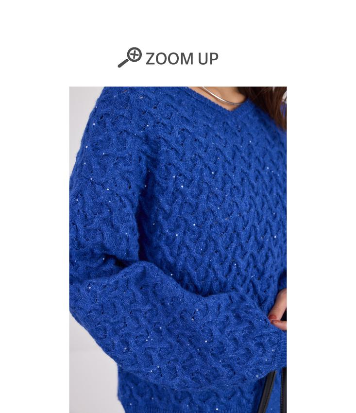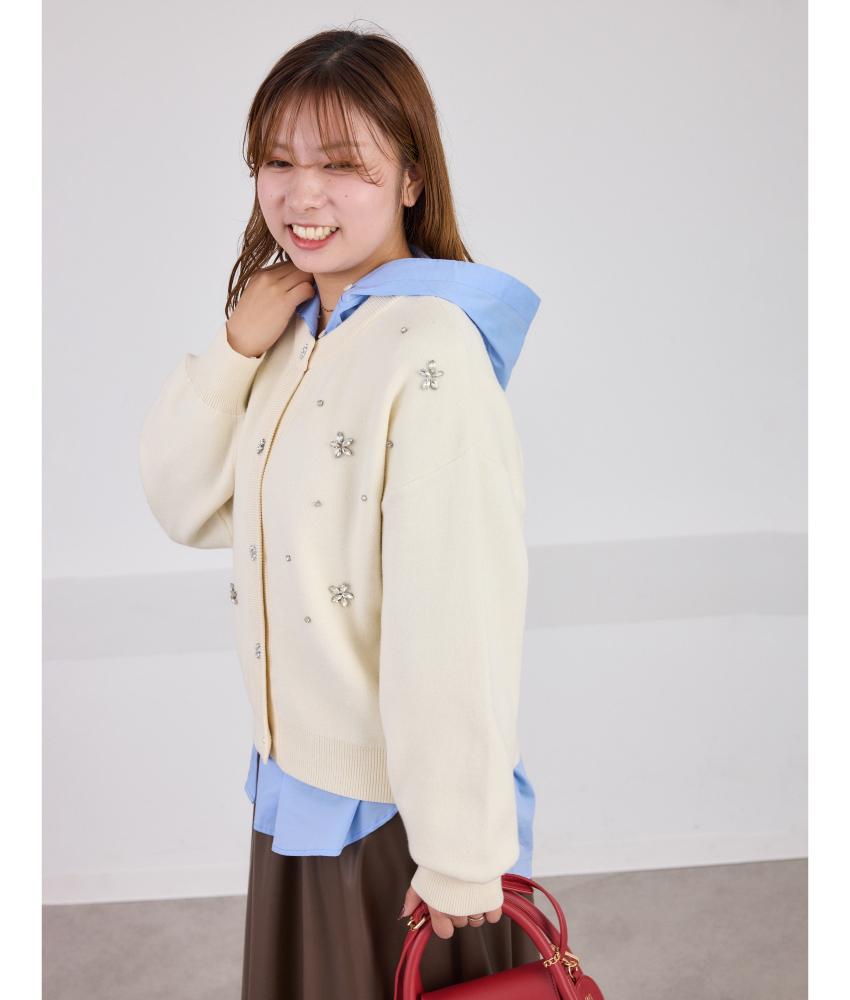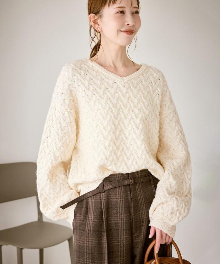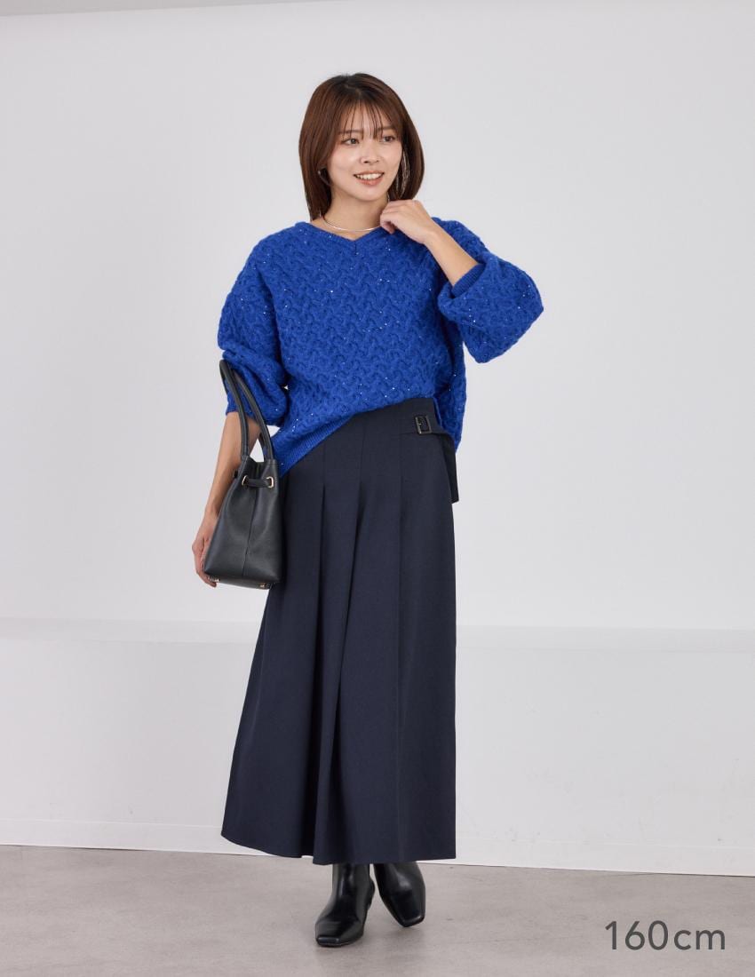 小花の形をしたスパンコールが編み地に埋め込まれたニット。Vネックで顔まわりを爽やかに着こなせるので、1枚で主役になる存在感ながら、デイリーにも着やすいのが魅力です。
