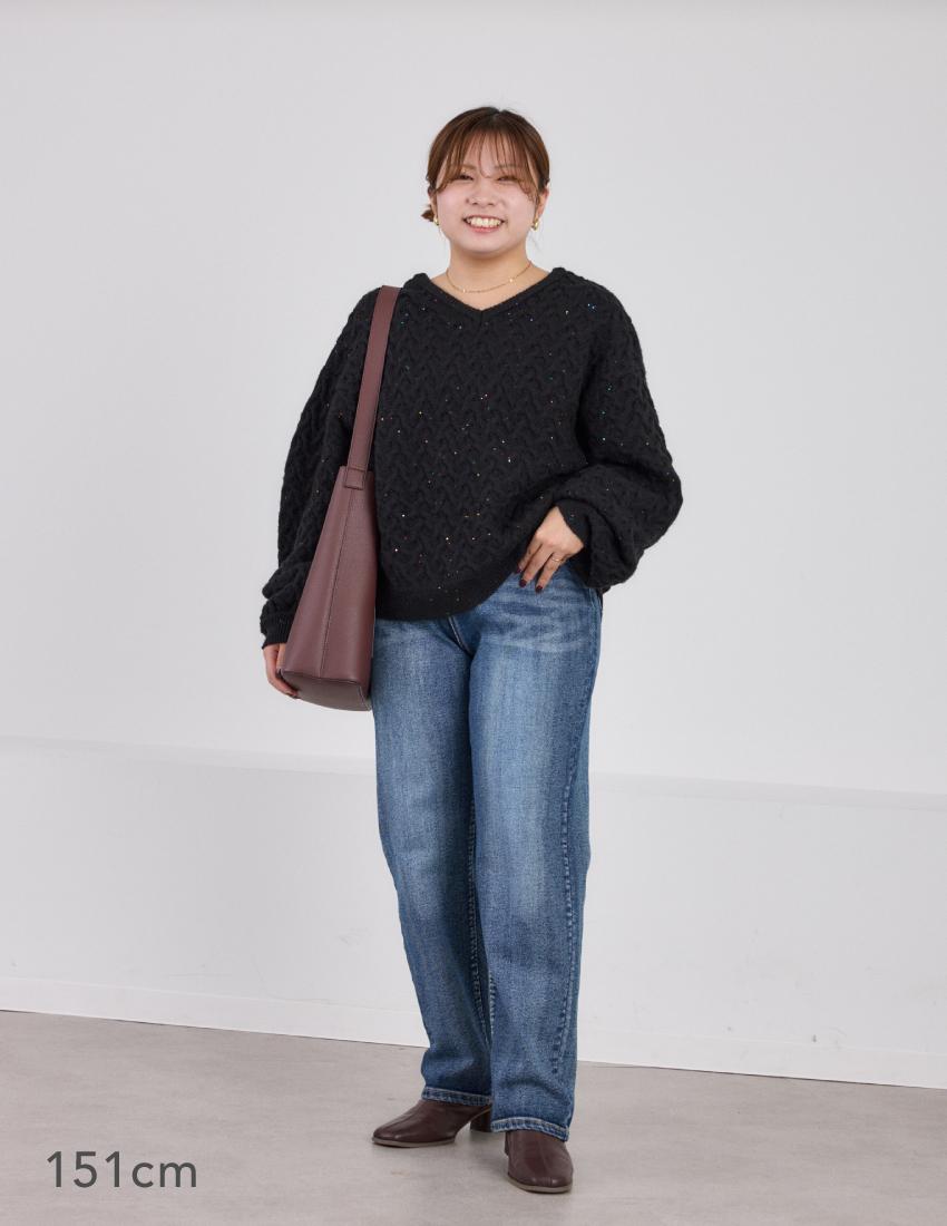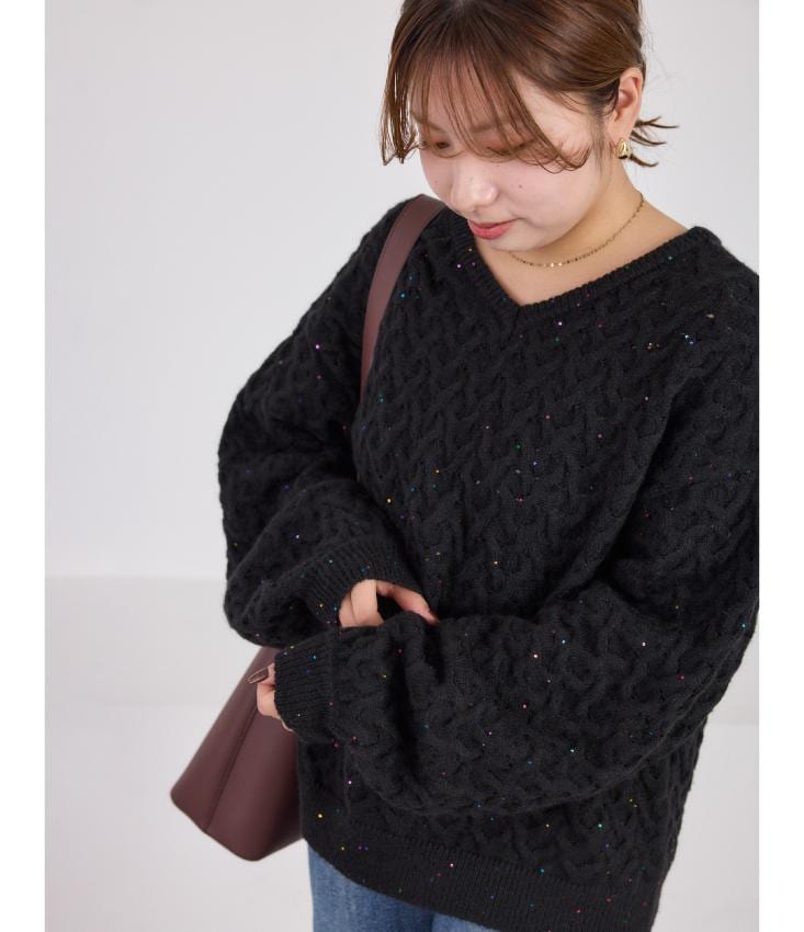 カラフルなきらめきが、黒の編み地にニュアンスをプラス。シンプルな装いもぐっと洒落て見えます。