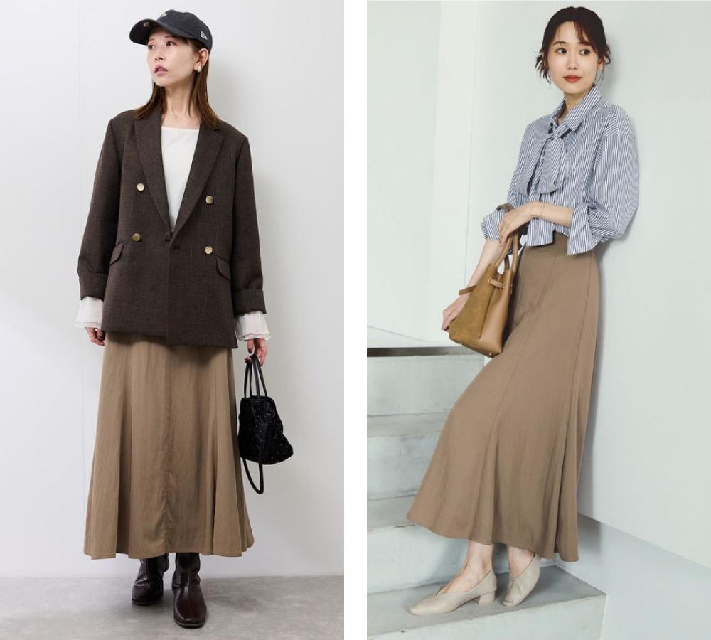 動くたびに揺れる軽やかなドレープ感が魅力のスカートは、ハンサムなスタイリングに取り入れても抜け感のある女性らしさを演出できます。