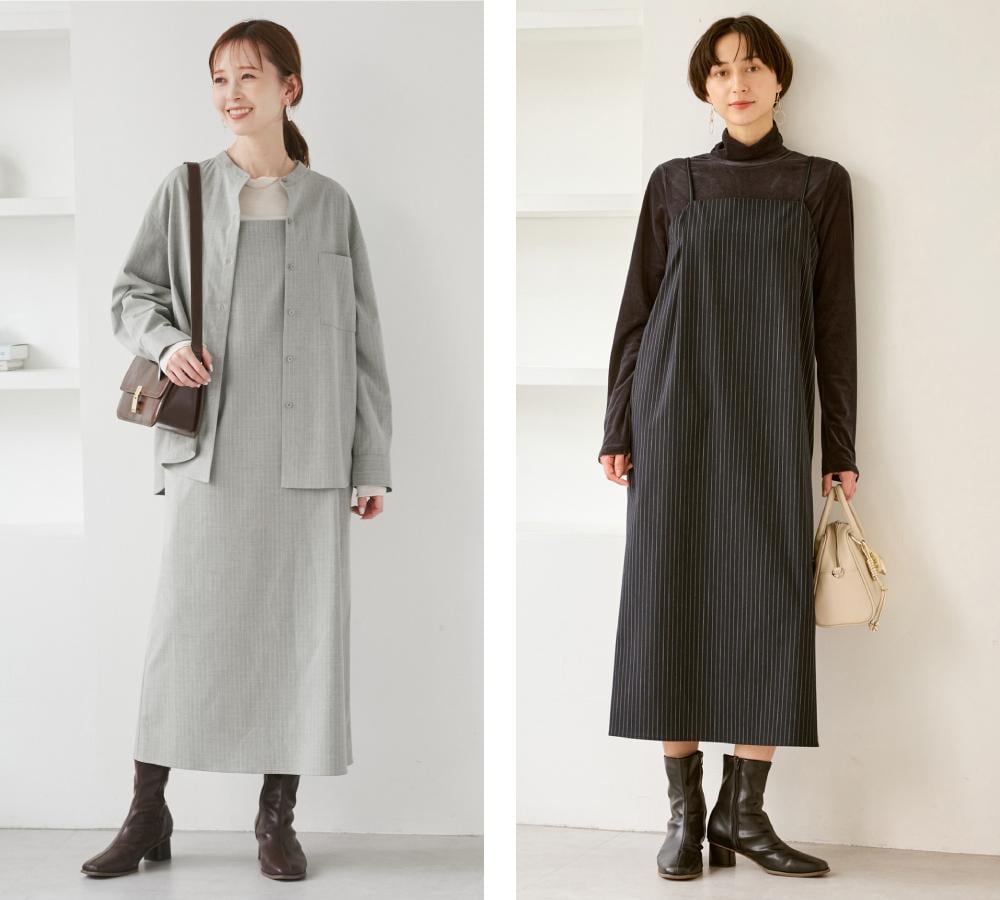 ストライプ生地とストンと落ちるシルエットで、体のラインを拾いにくい大人仕様のキャミワンピ。
