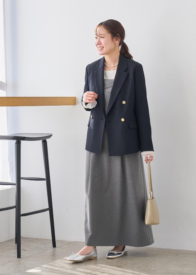 ワンピースの上にジャケットを羽織るだけで、きちんとしたおでかけスタイルに。