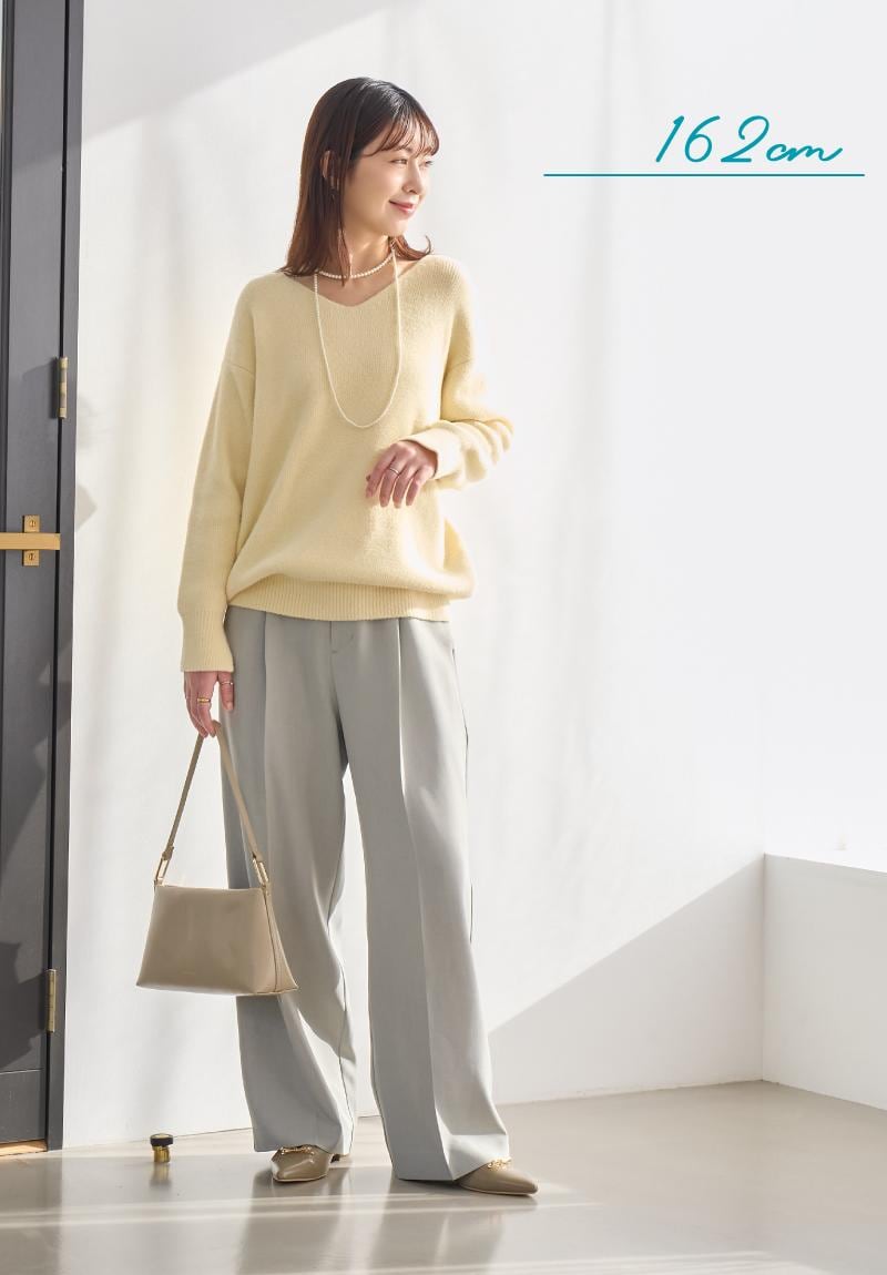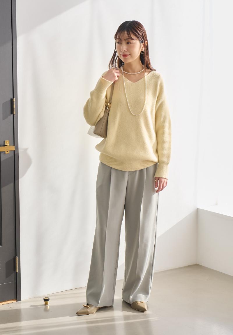ゆったりニットはパンツアウトでリラックスムードに。 パンツの履く位置を少し下げて、落ち感のあるシルエットがこなれ感を生み出すテクニック。