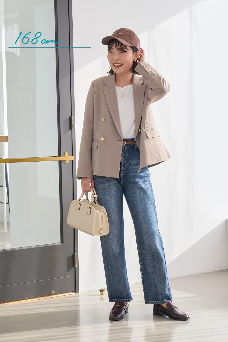 カジュアルなデニム+キャップにジャケットを羽織るだけでワンランクアップな装いに。