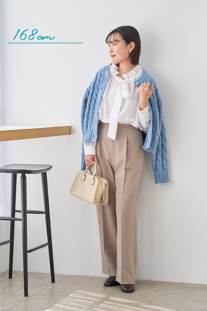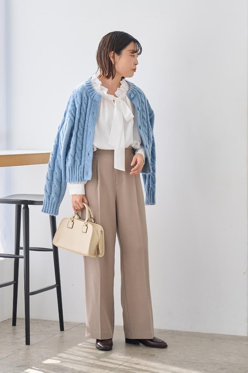 上に羽織るアイテムの襟に合わせて、フロントのボウタイを緩めたり調整できるブラウスをイン。