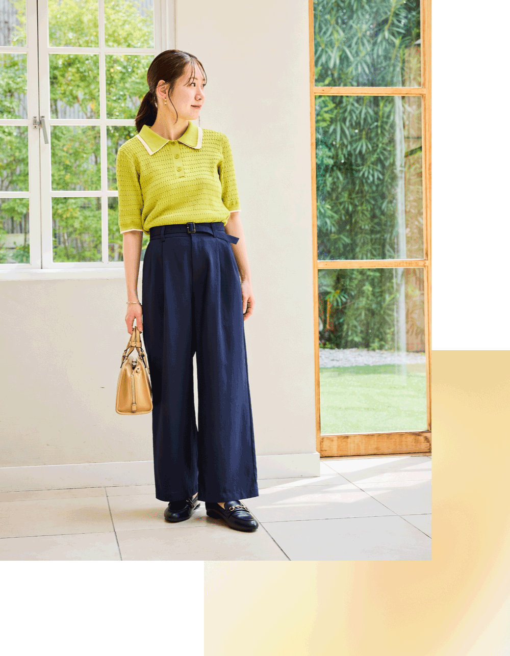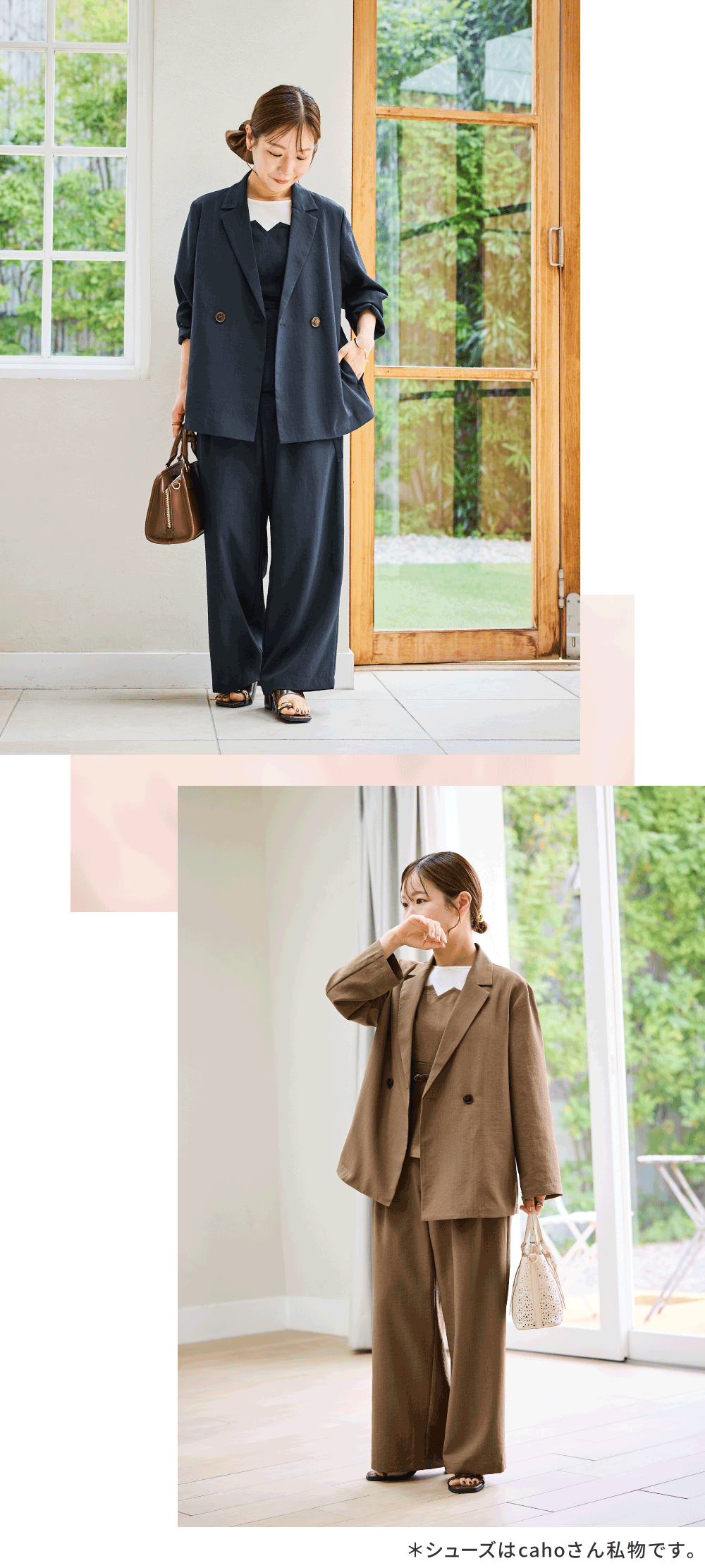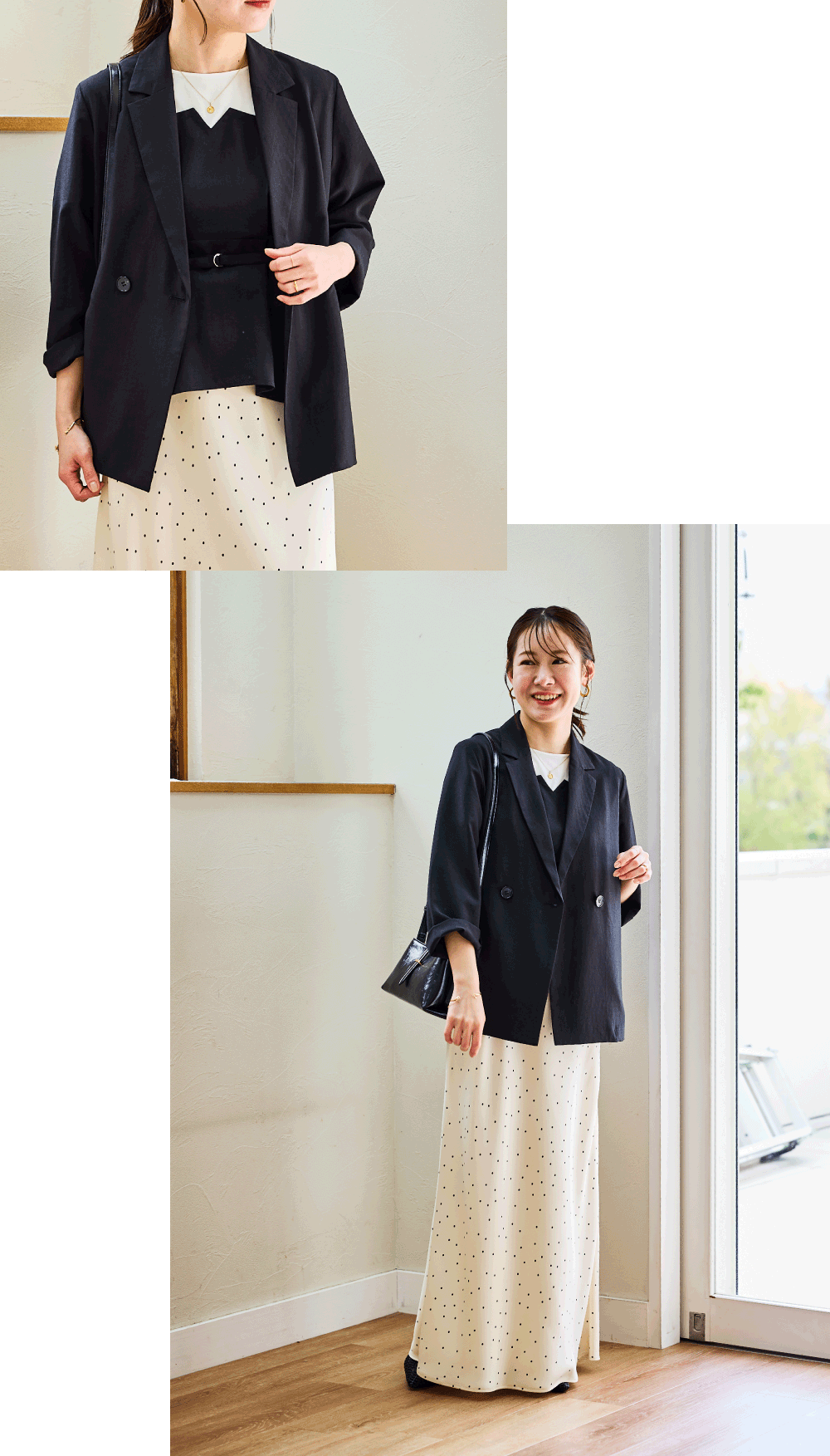 小柄さんに合わせた丈感とシルエットで、きちんと感がありながら、ほどよくリラックスした印象に。
