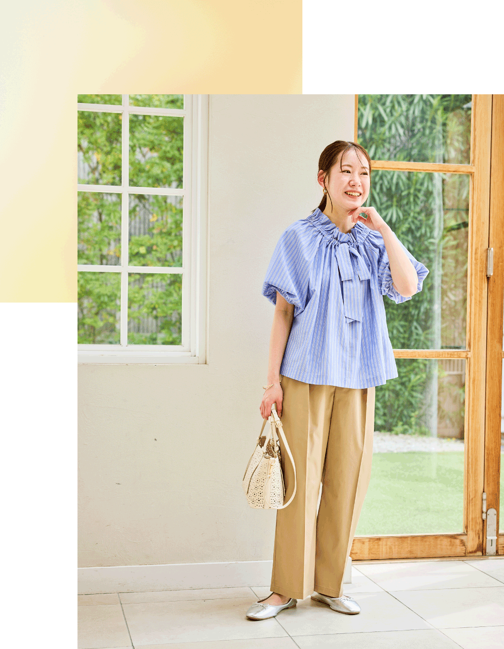 襟元フリルのブラウスはスッキリ見えするパンツと合わせ、ふんわりシルエットを生かすと◎。
