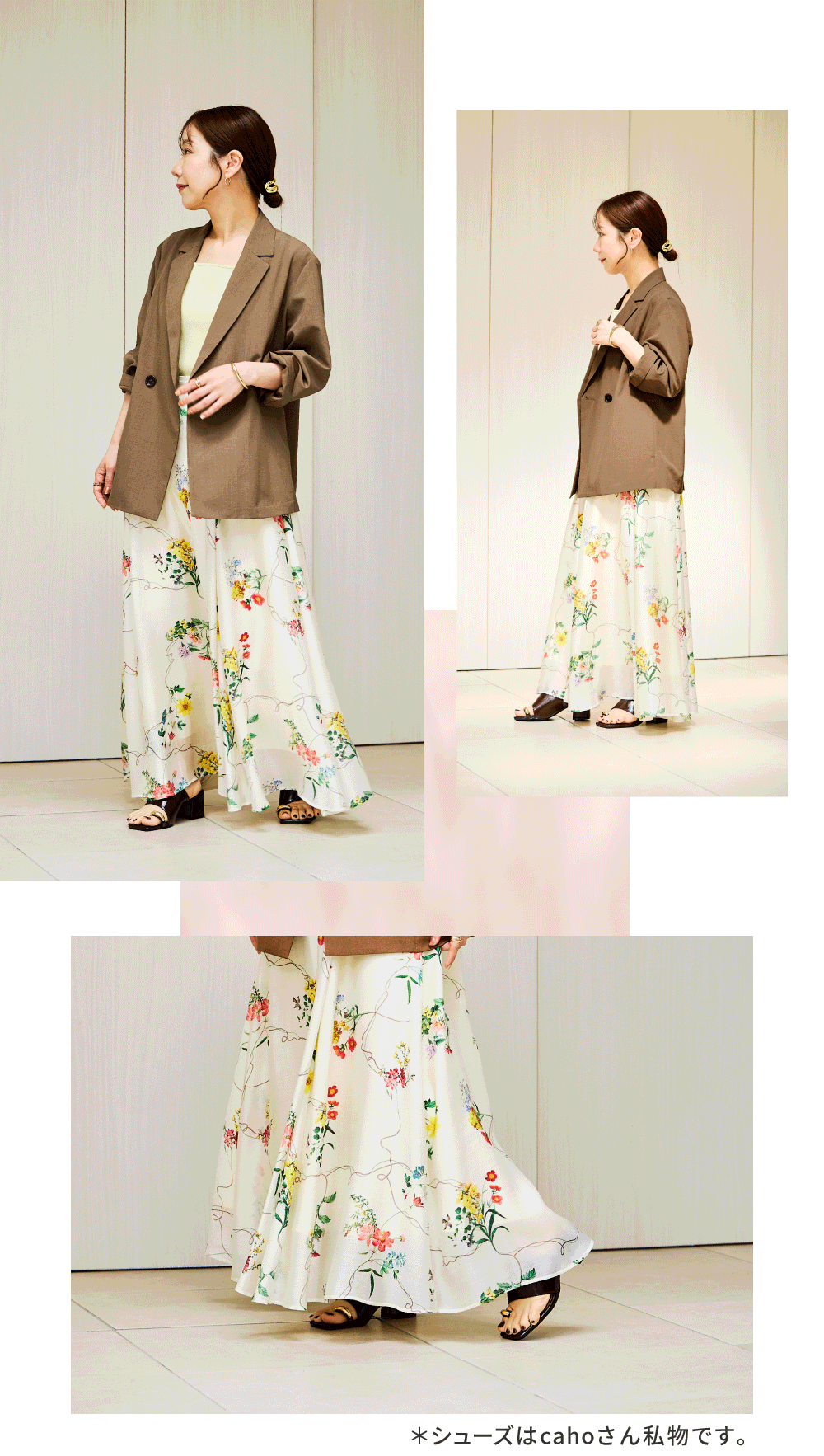 軽やかなリネンライク素材のジャケットがフェミニンな花柄スカートを引き締め、こなれた印象に。