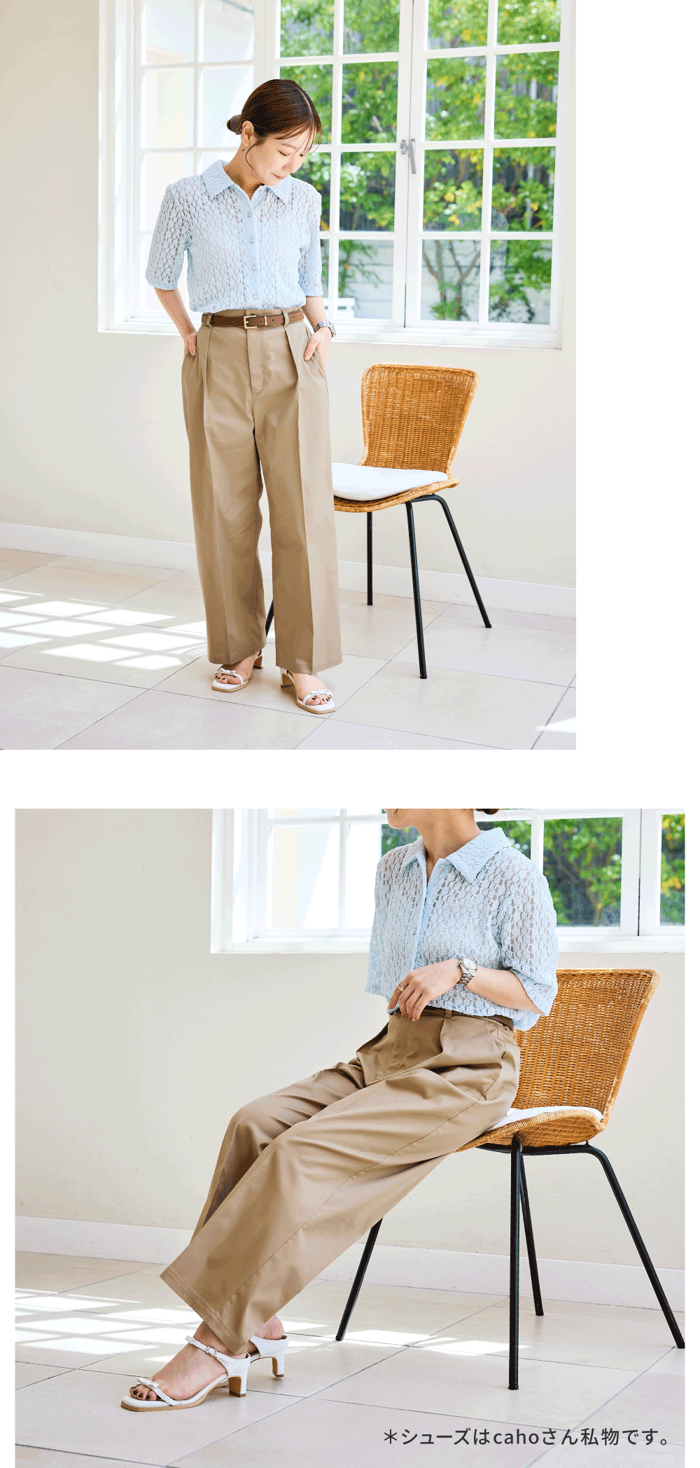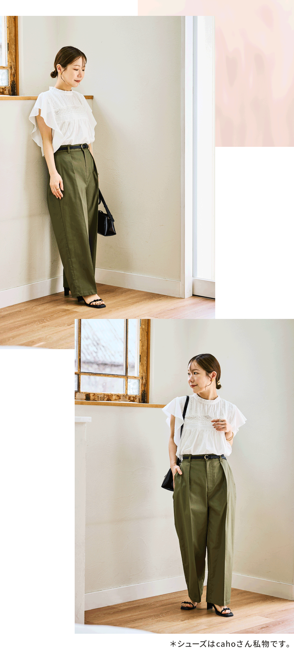ややハイウエストのチノパンツにレース襟トップスを軽くインし、ベルトでウエストマーク。