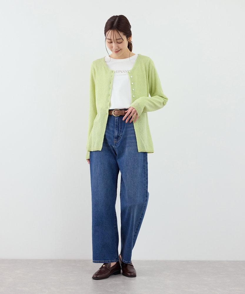 顔まわりやデコルテをすっきり見せるVネックのカーディガンは、上半身のボリュームを抑えたいストレートタイプのマストアイテム。