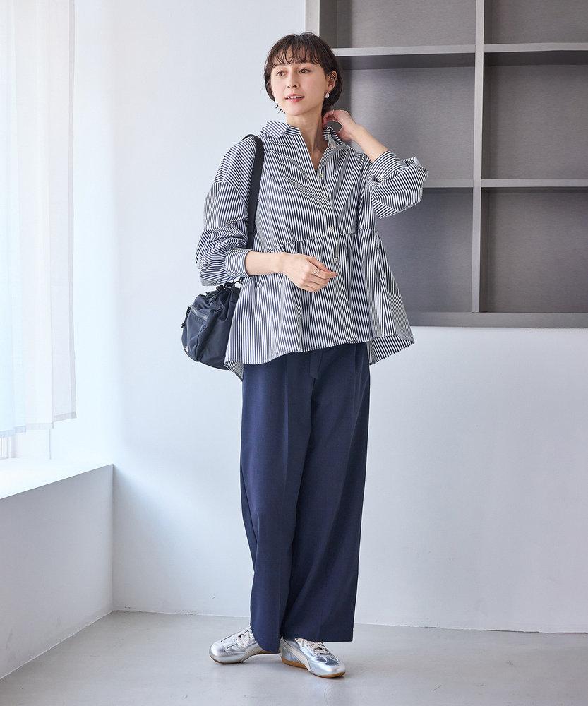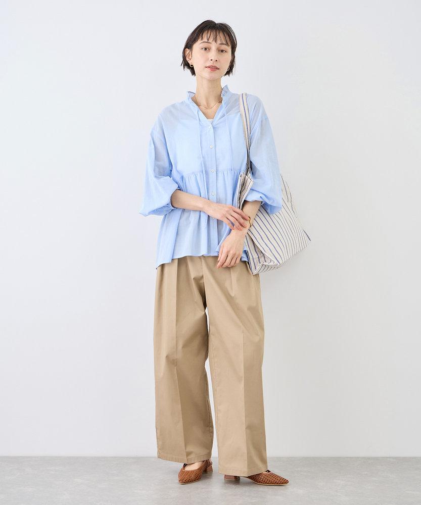 シャツにフェミニンな要素がある分、ボトムスにはワイドパンツやフレアパンツが好相性。