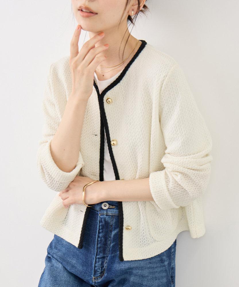 ゴールドボタンが華を添える透かし編みのジャケット風カーディガンは、一目で好印象に導いてくれそう。