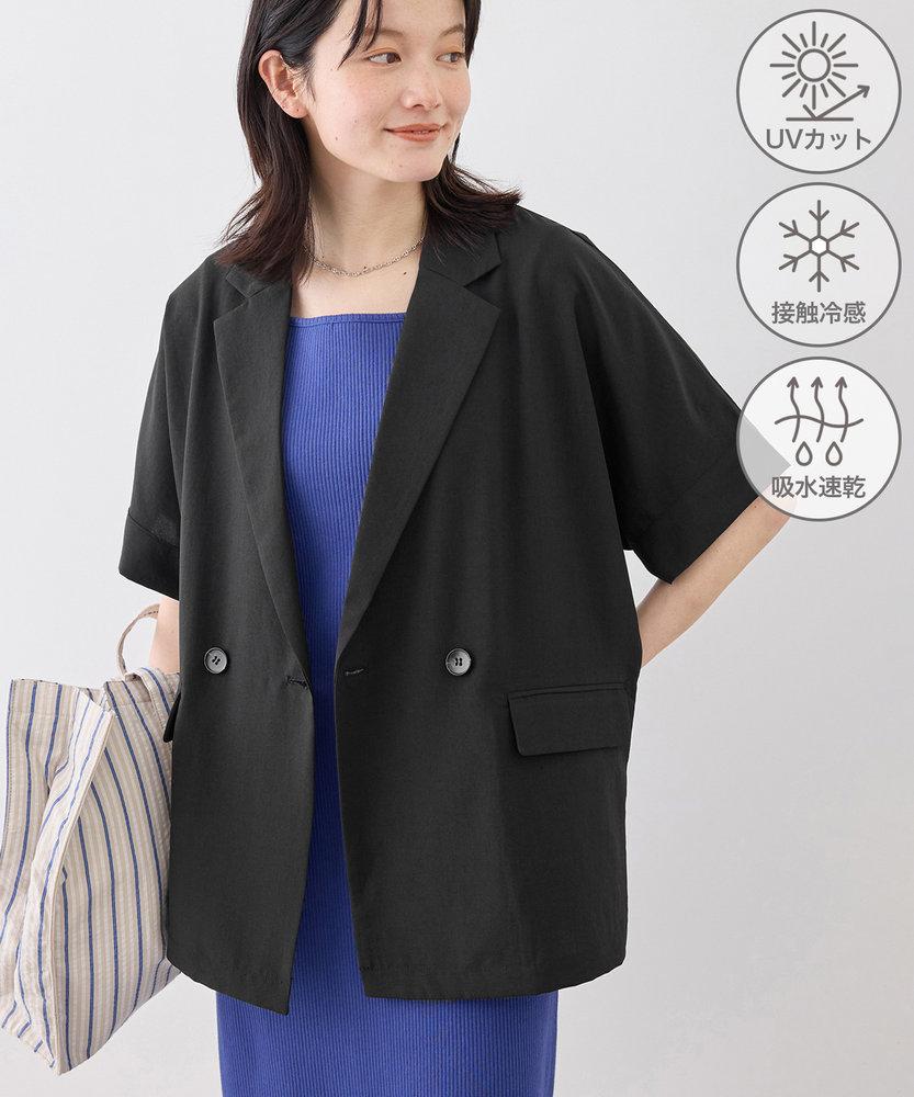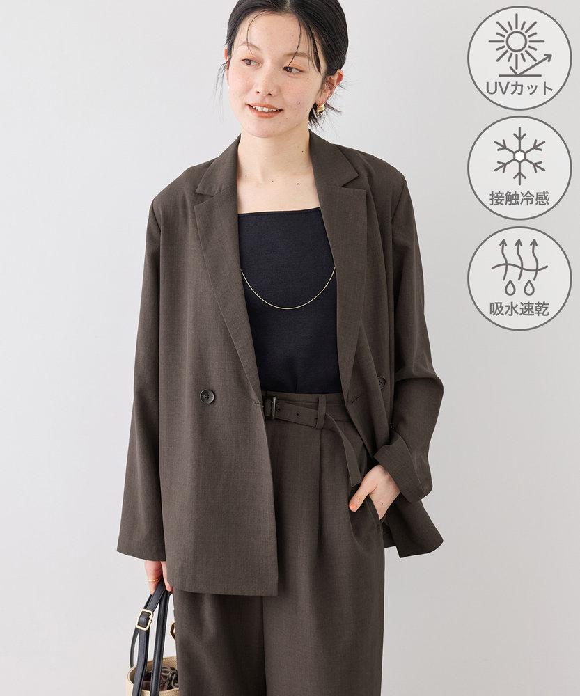 シャツ感覚で羽織れる軽やかなダブルジャケット。ジャストサイズの作りで、着やせ効果も抜群です。