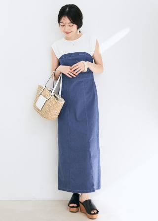 高めに設定したウエスト位置や前スリット入りで、すっきり縦見えするワンピース。