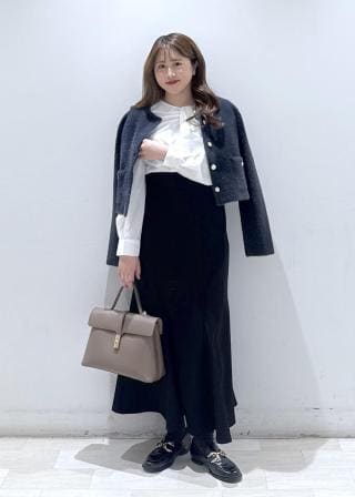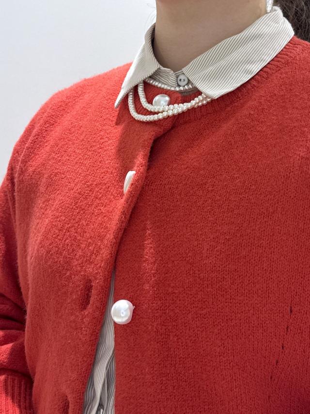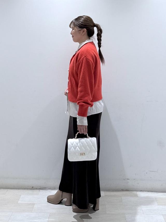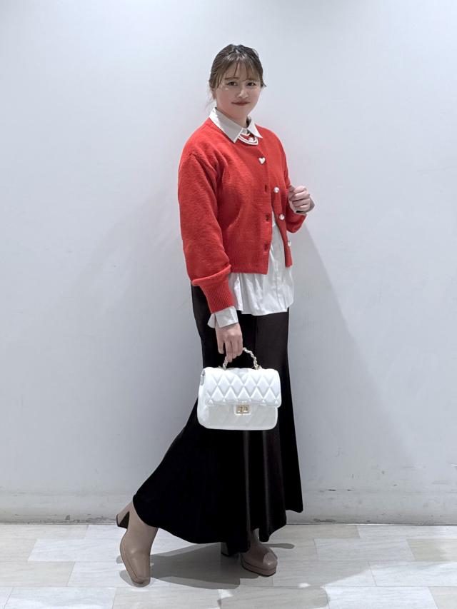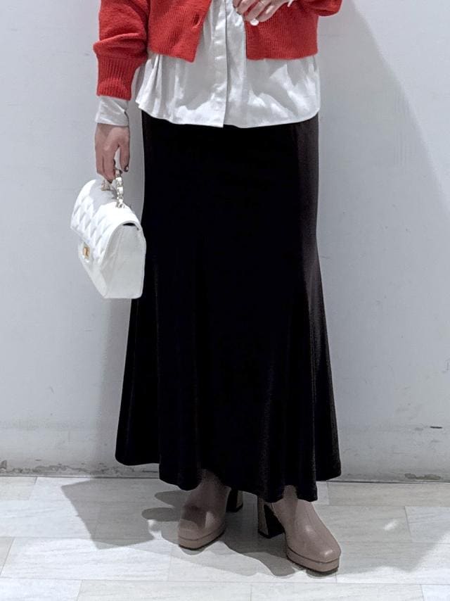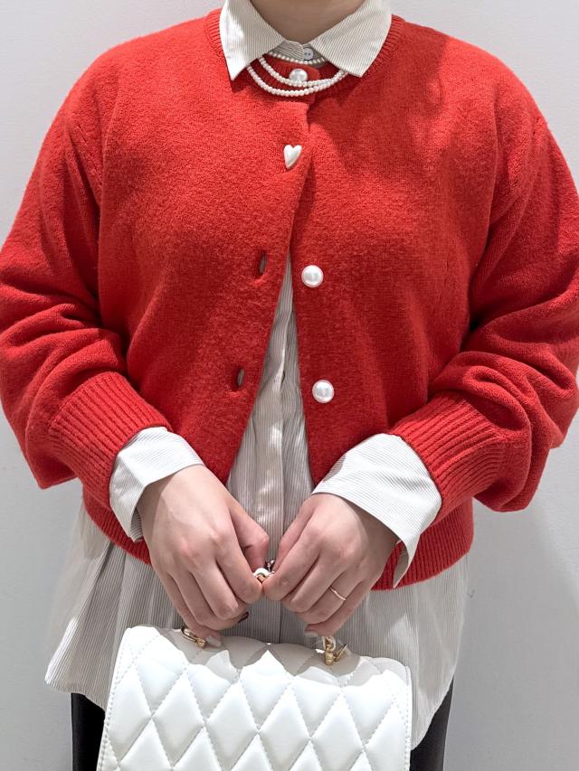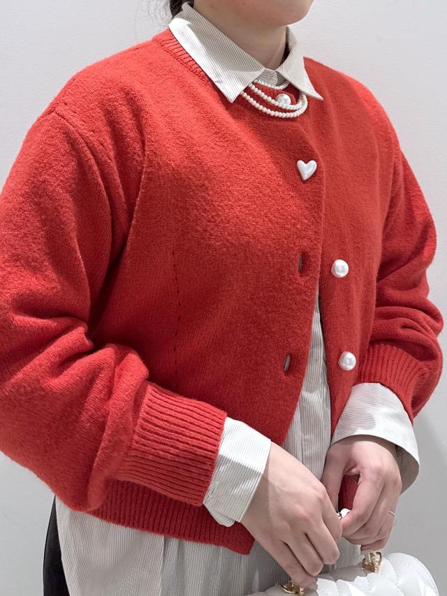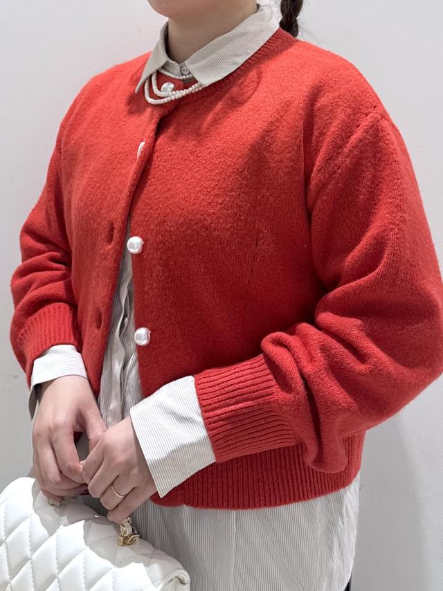 今回は新色で入荷しました赤のパールボタンカーディガンに、ベロアスカートを着用して冬らしいコーディネートにしてみました。
