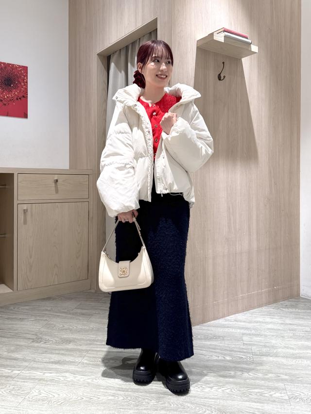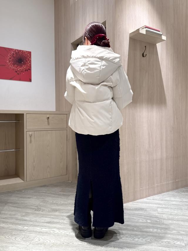 ダウンがサラサラとした素材だったので、ボトムスには異素材のニットスカートを合わせました!