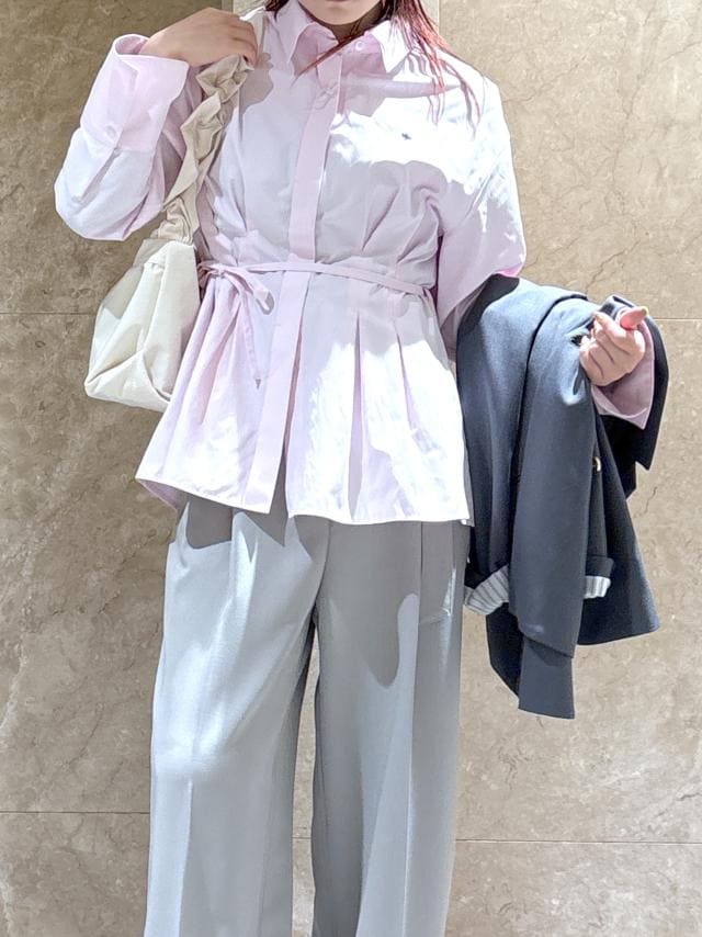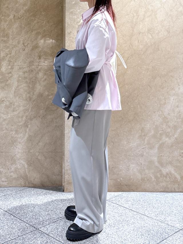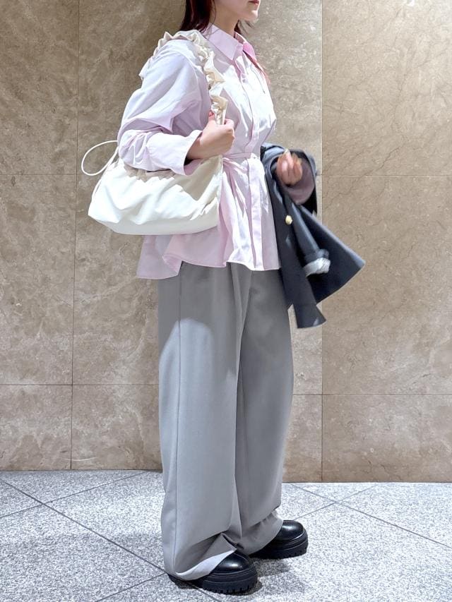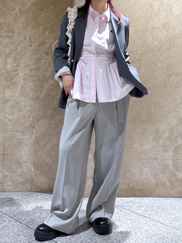 ピンクのPOLOのシャツにグレーのワイドパンツとジャケット合わせました。