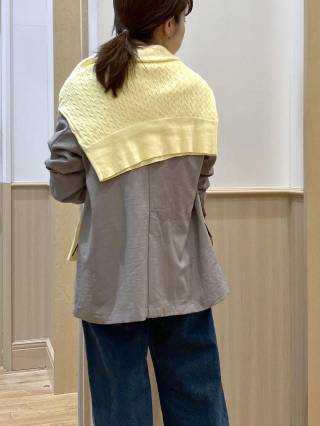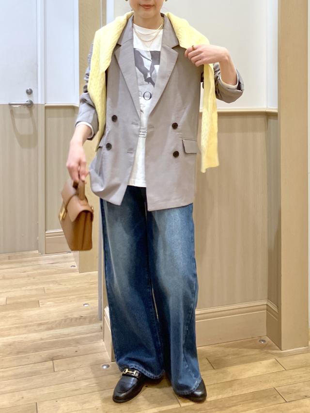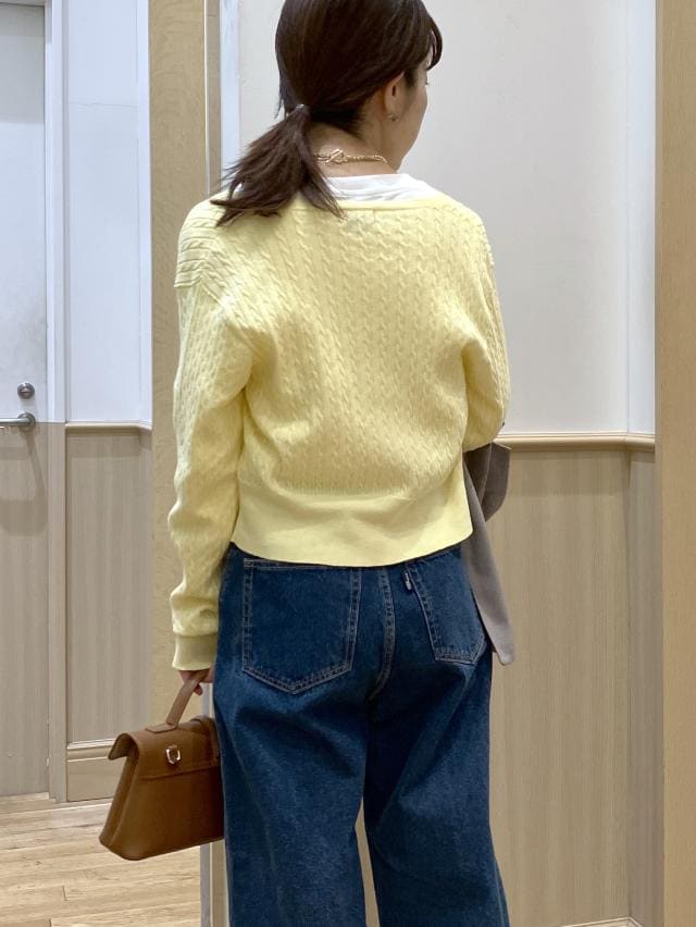 肩に掛けた黄色のカーデをポイントにした、シンプルなデニムstylingです。オシャレ感UPだけで無く、気温に応じてカーデを着たりもできるので気温変化のある春先に◎
