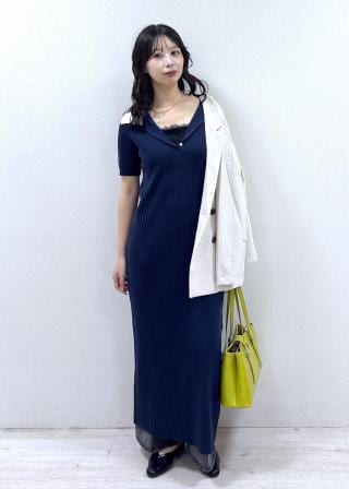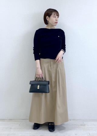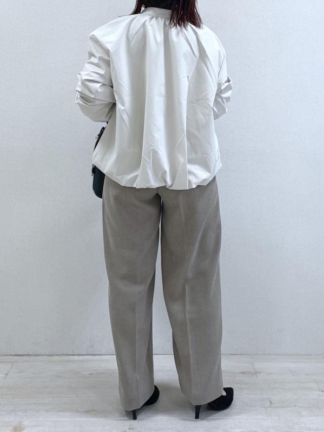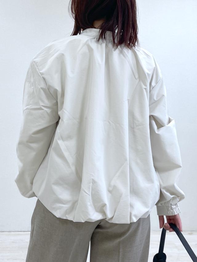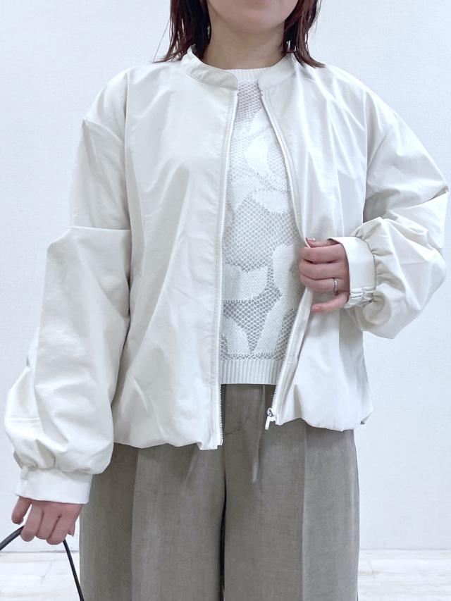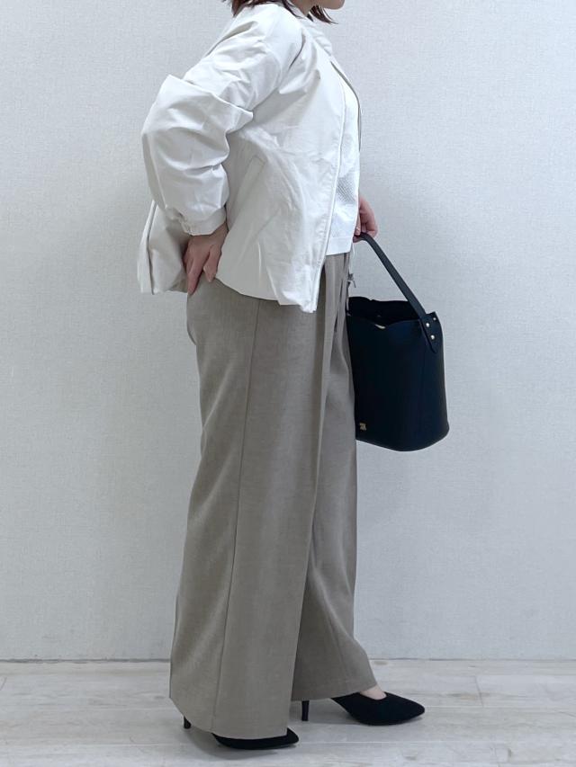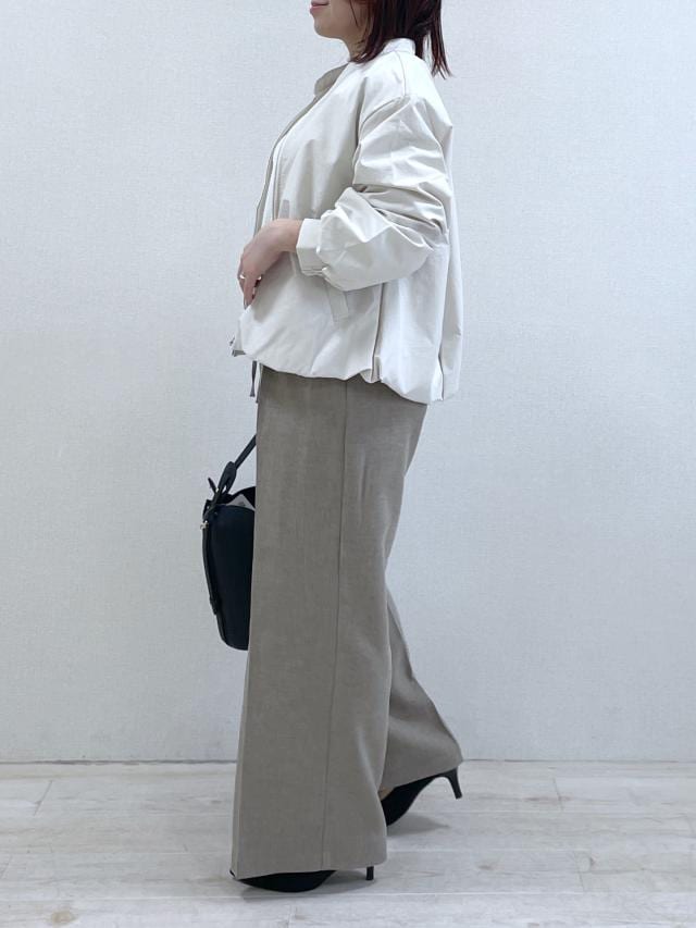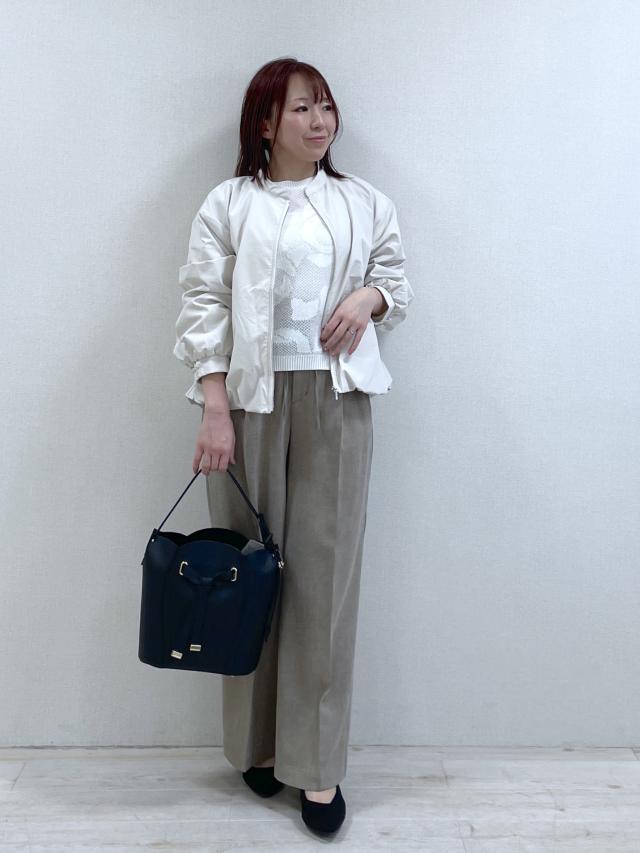 寒暖差があるので薄めのアウター、ブルゾンを合わせて綺麗めジュアルにコーデしています。
