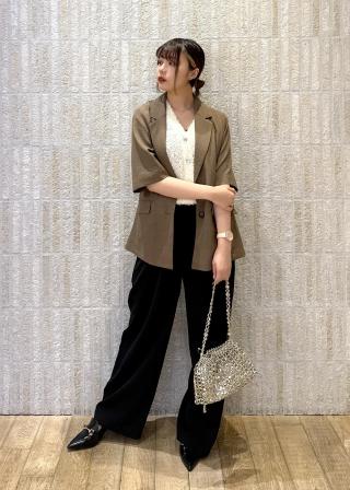 ・ウエストマークで細見せしつつ、パンツ部分にタックを入れることで気になるお腹周りを強調しないデザインにしています