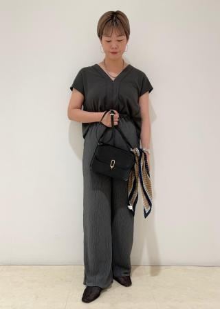 ジャンプスーツですが上下の素材を少し変えているのがお洒落なポイントです。