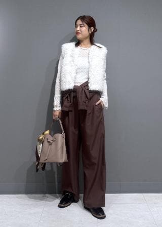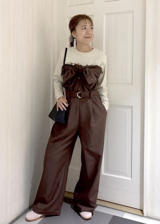 ウエストのベルトである程度調節ができるので、インナーにロンTやベロアなどの素材を合わせるのもおすすめです!