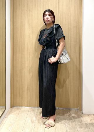 ショルダーフリルが印象的なので、インナーはシンプルなアイテムを選ぶだけできまります。