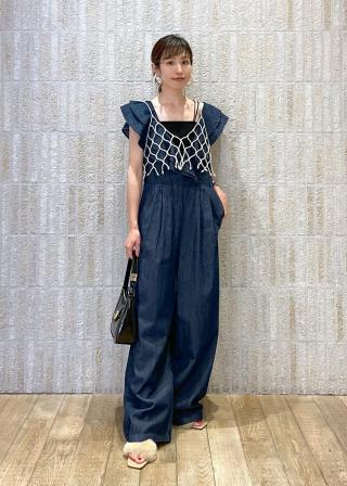 肩にあしらわれたフリルがフェミニンカジュアルな印象のオールインワン。