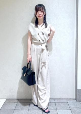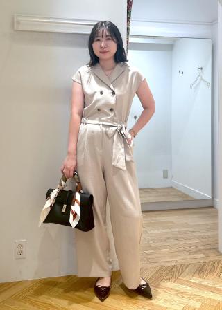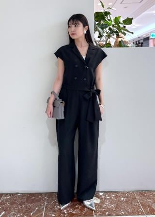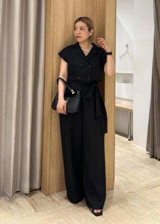 ダブル釦でスタイリッシュな雰囲気が素敵なオールインワン、かっちりしすぎないようにウエストをゴムにし柔らかい素材を使うことでオンオフどちらでも使えるデザインにしました。