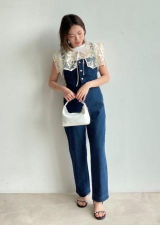 細身えするレディライクなデザインになっており、カジュアルすぎないオーバーオールです。