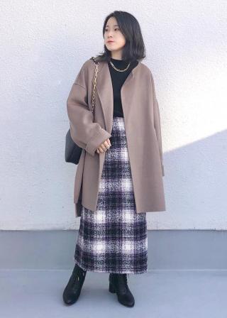 ノーカラーリバーコートはロングブーツでもバランス良く着ていただける丈にしました。