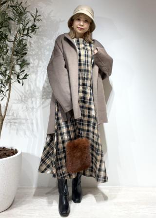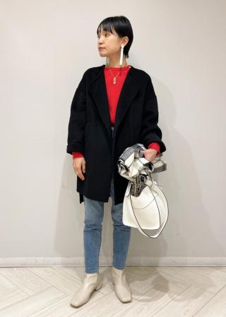 ノーカラーリバーコートはロングブーツでもバランス良く着ていただける丈にしました。