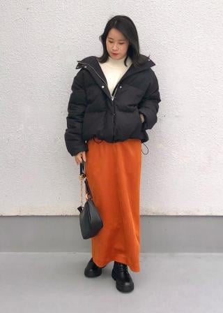 着丈はヒップがしっかり隠れるほどなので、インナーやボトムはすっきりとしたシルエットの合わせがおすすめです◎