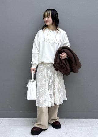 ボリュームがある分ボトムはミニ丈でバランスよくスタイリングができます。また、レースなどの素材を組み合わせることでハンサムでありながらレディな印象に。