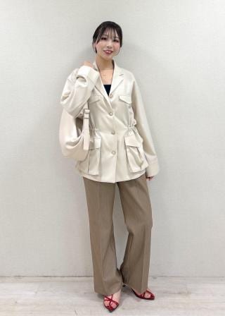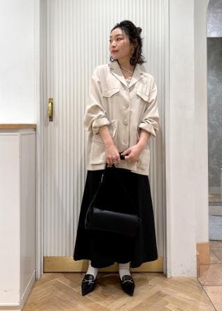 トレンドのミリタリーディテールをデザインポイントにリネン調の素材で女性らしく着れるアイテムに仕上げました。