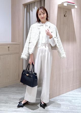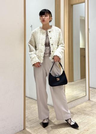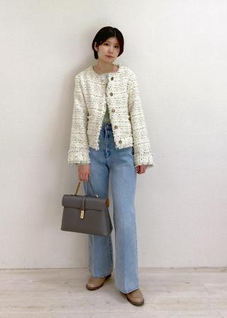 春に着たいツイードジャケットを先取りしてみました!ホワイトとゴールドのツイードで生地が少しフンワリとしているところが、とても可愛いらしい一着です。着丈はスッキリ目ですが、バックスタイルは少しゆるっとしたデザインです。