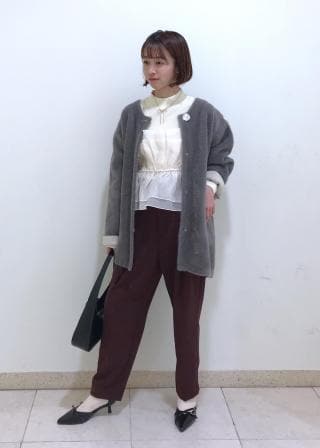 ノーカラーデザインなので、ストールやタートルネックなど首元にボリュームを持たせたスタイリングもしやすい一着。