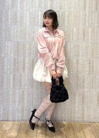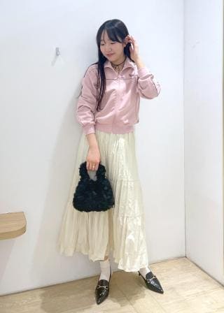 同素材の「配色ラインIラインスカート」とセットアップで着用できます。