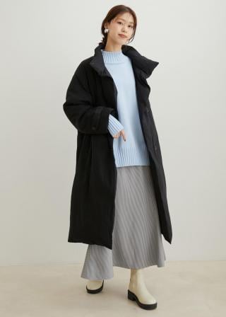 高さのあるスタンドカラーの中綿コート。