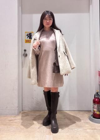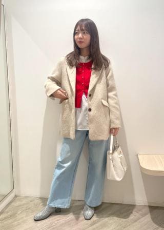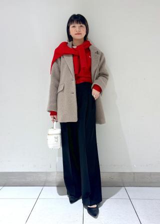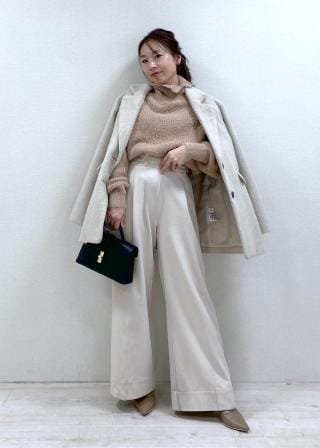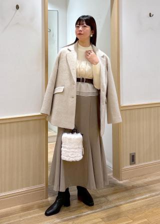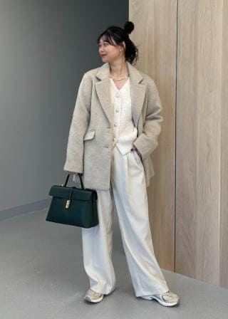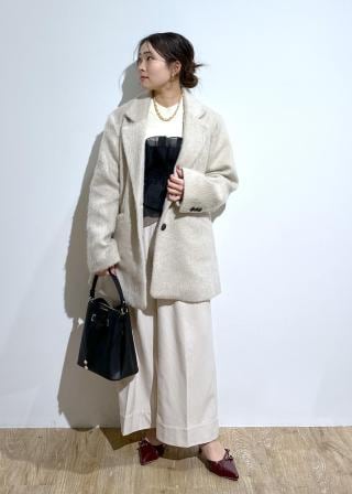 着丈がヒップ下まであるので、ボトムはIライン系のスカートやパンツなどおススメです。