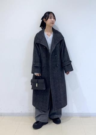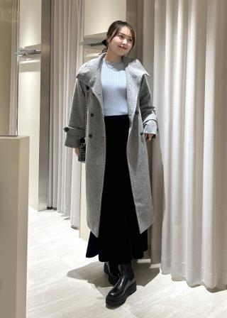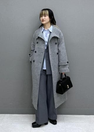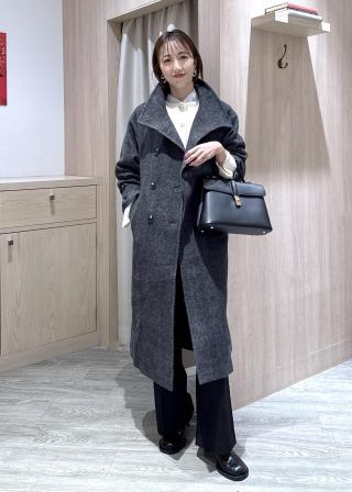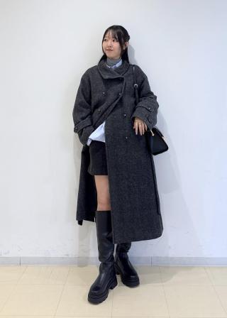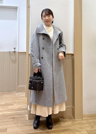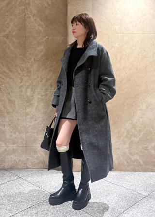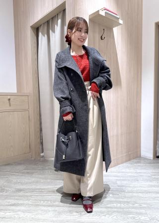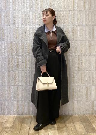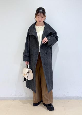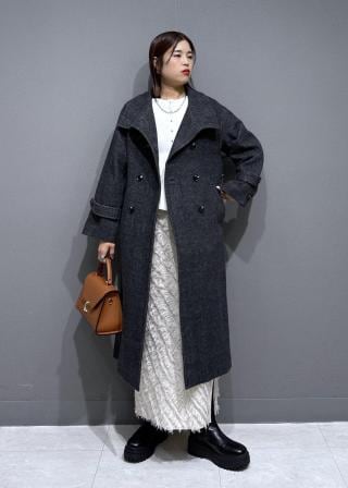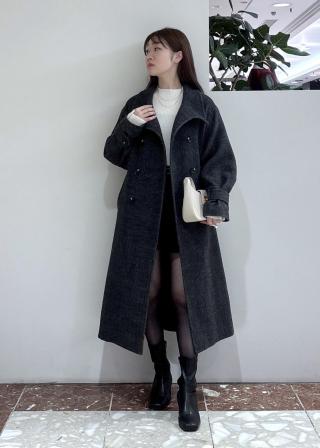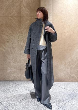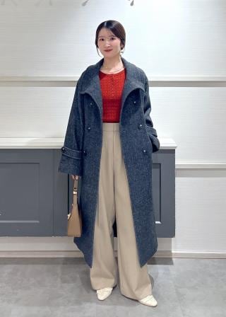 冬の寒い時期にネックをしっかり防寒してくれるスタンドカラーとフロント釦の上4段をはずして、開いて抜け感のある着方で女っぽくスタイリング出来る衿デザインにしました!厚手のインナーにも対応できるリラックス感のある程良いゆったりシルエット!今シーズンのトレンドでもあるウエストマークのコーディネートですが、共布ベルトでキュっと女らしいスタリングをアップデートしてくれます。