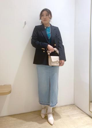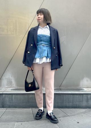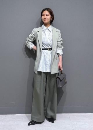 ボトムはワイドスラックスパンツやIラインスカートなどのストレートシルエットがバランスがいいです。