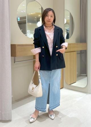きちんと感のある肩幅と着丈のバランス、控えめな光沢感のゴールド釦が女らしい一着です。