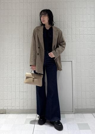 袖丈も手の甲が隠れ、肩周りもゆったりと落ちるデザインなので、全体的にこなれ感の出せるオーバーサイズで、インナーには厚手のニットを着られる余裕もあり!写真のコーディネートではウエストのベルトを外して着用しています。高見えする上質な素材感ですが、重さはなく着心地は軽やか◎。厚手すぎないため、今の時期から冬、また春先にも長く着用できそう!ダークブラウンのカラーをリアルバイしました。